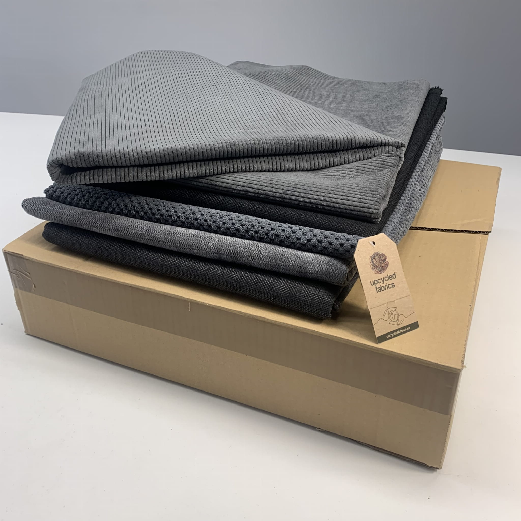 Zestawy z tkaninami są starannie składane, zabezpieczane i zapakowane w kartonowe pudełka o wymiarach 50x50x10 cm.
